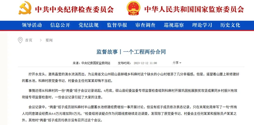 12月12日,中央纪委国家监委网站刊载文山州新闻稿件:《监督故事丨一个工程两份合同》。