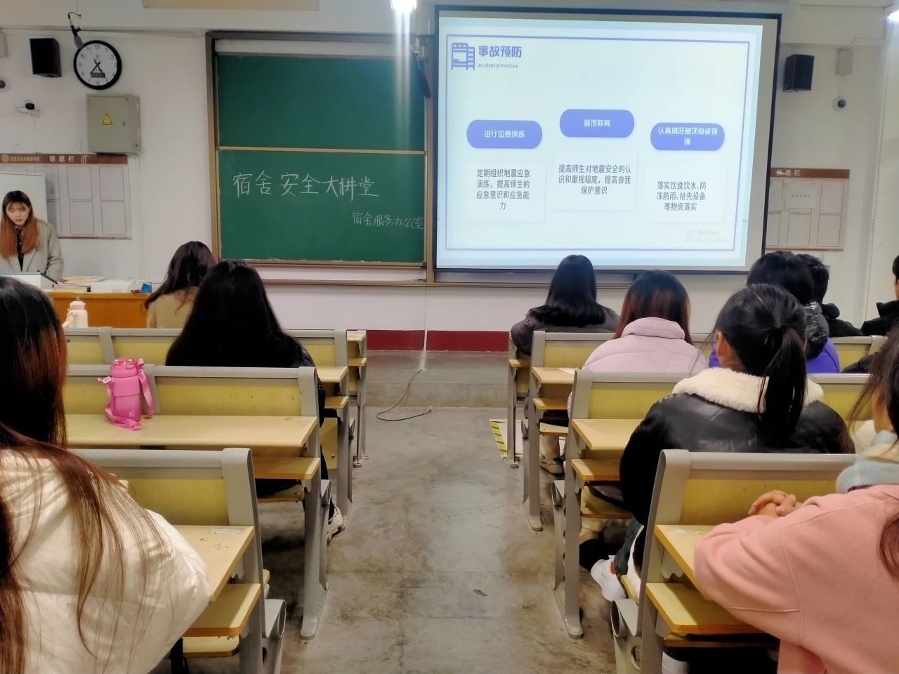 本次大讲堂主要围绕三方面展开。一是地震灾害的预防和应对。主讲人禹艺菲强调在日常生活中要以预防为主,包括定期进行应急演练、加强宣传教育、认真做好各项物资保障等等。当地震发生时,务必保持镇静,按照逃生路线有序逃离。二是火灾的防灾减灾措施。火灾预防须做到“四不”:不在宿舍内使用大功率电器、不乱拉电线、不焚烧杂物、不乱扔烟头,此外严禁在公寓楼道内和消防疏散通道口停放自行车或堆放杂物,除此之外还要熟悉灭火器的基本使用方法,当火灾来临时保持冷静、正确灭火。三是谨防校园诈骗。主要包括推销诈骗、校园贷款、兼职求职诈骗、传销陷阱、冒充角色诈骗、网络购物诈骗、虚假中奖信息诈骗等,在遇到上述情况时,要及时向班主任和保卫处反映,以免造成重大经济损失。最后禹艺菲提醒各位同学,一定要提高警惕,遵纪守法,做一名文明、健康、有为、诚信的老员工。