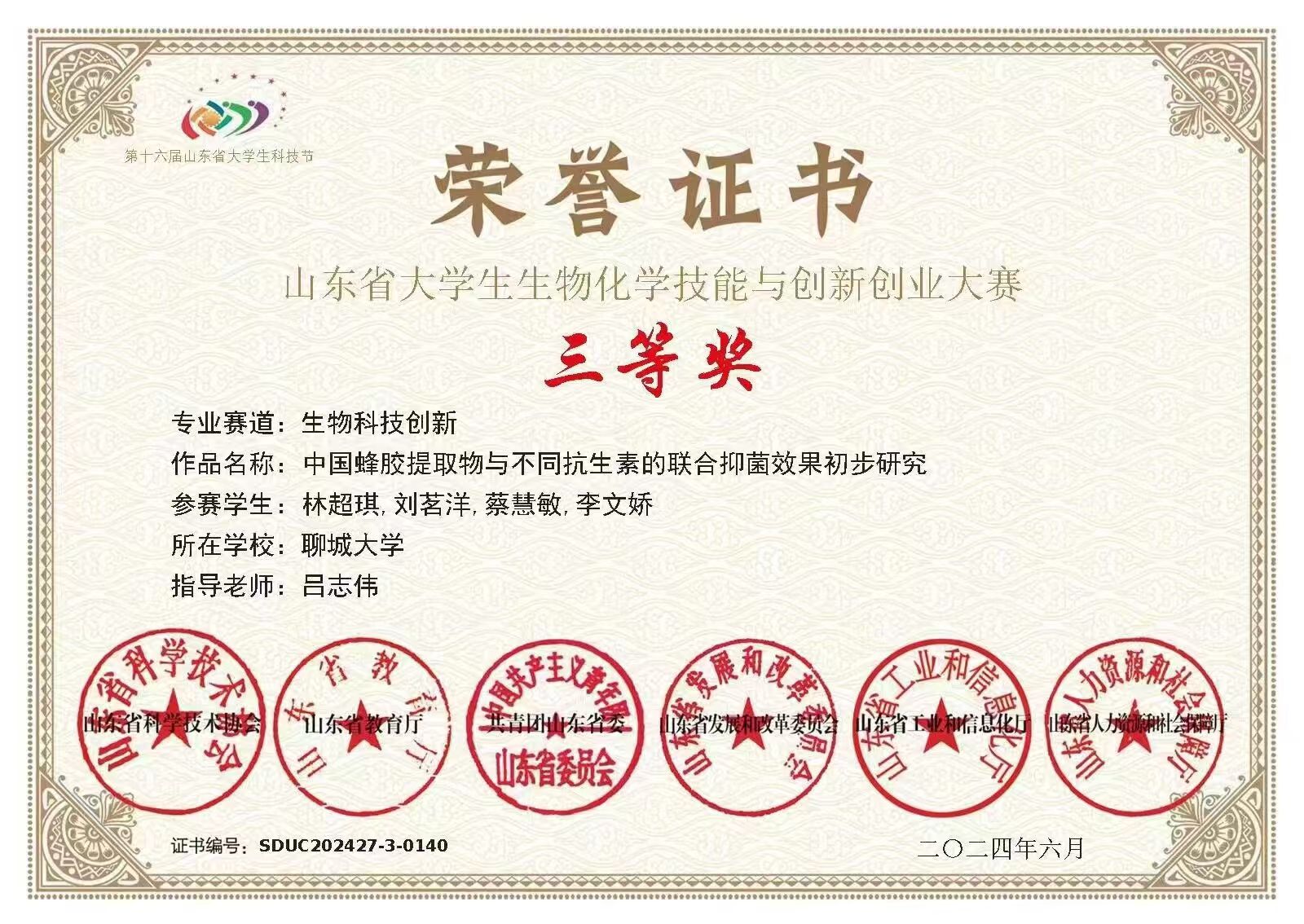 热烈祝贺三亿体育林超琪荣获“山东省老员工生物化学技能与创新创业大赛(2024,创新创业类)”二等奖