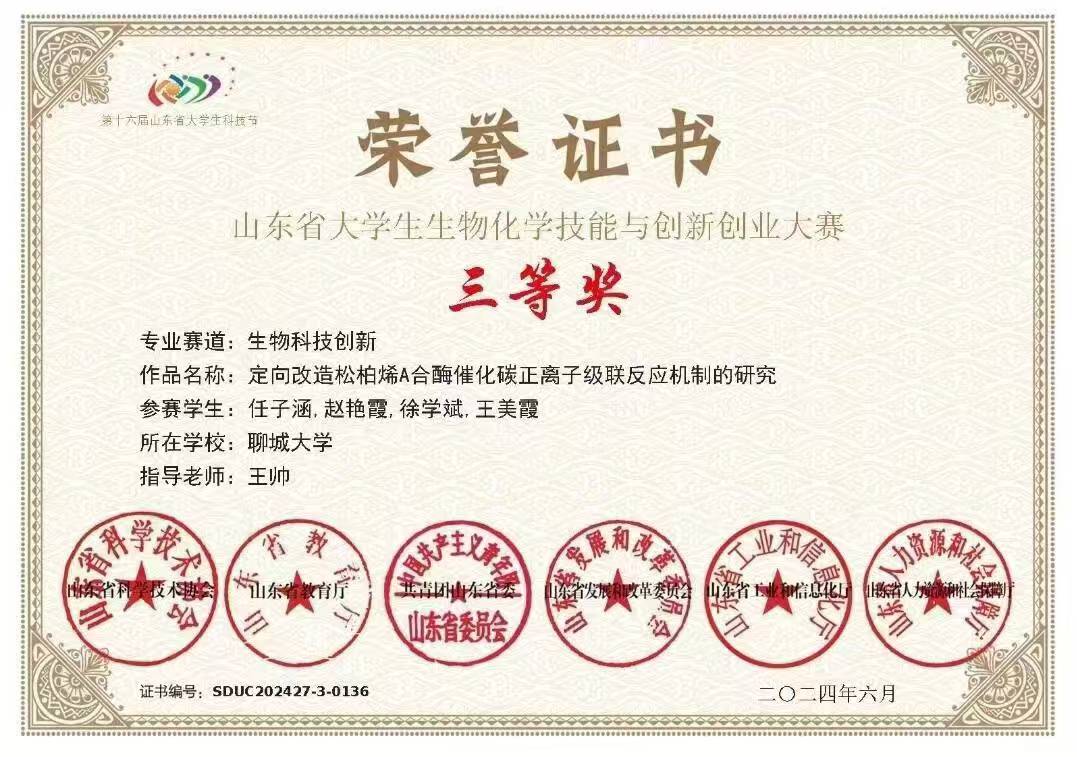 热烈祝贺三亿体育王美霞荣获“山东省老员工生物化学技能与创新创业大赛(2024,创新创业类)”二等奖