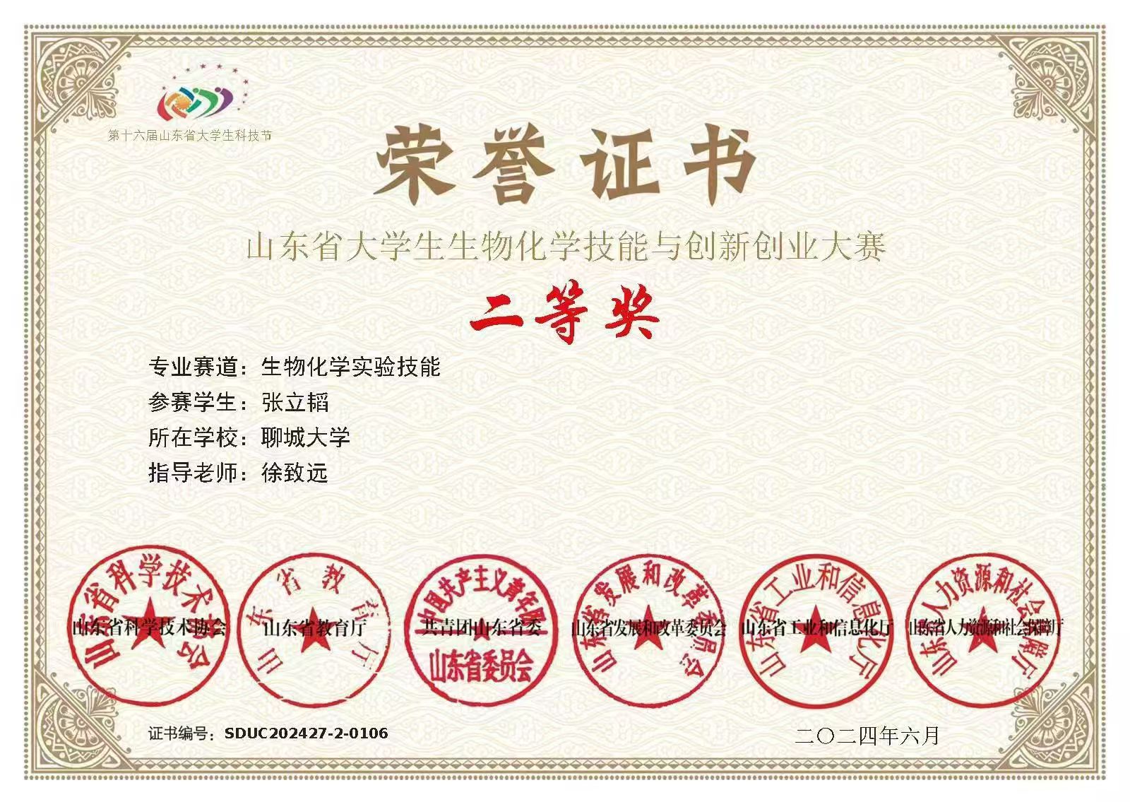 热烈祝贺三亿体育张立韬荣获“山东省老员工生物化学技能与创新创业大赛(2024,创新创业类)”二等奖