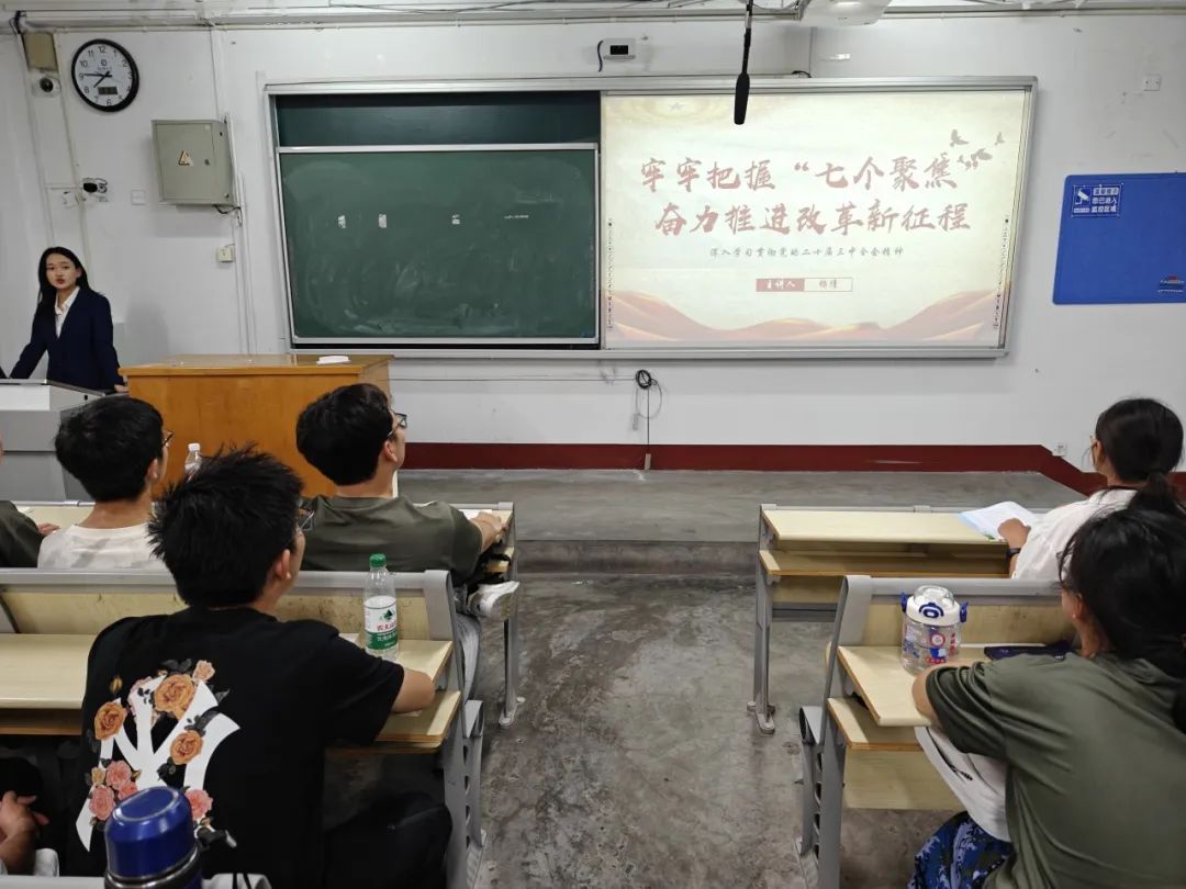 为深入学习贯彻党的二十届三中全会精神,帮助广大青年准确把握全面深化改革的目标任务和重大意义,9月18日,公司于三亿体育官网东校区2#202、309举办“牢牢把握‘七个聚焦’,奋力推进改革新征程”主题教育宣讲会,邀请政治与公共管理公司23级研究生杨倩担任主讲人。