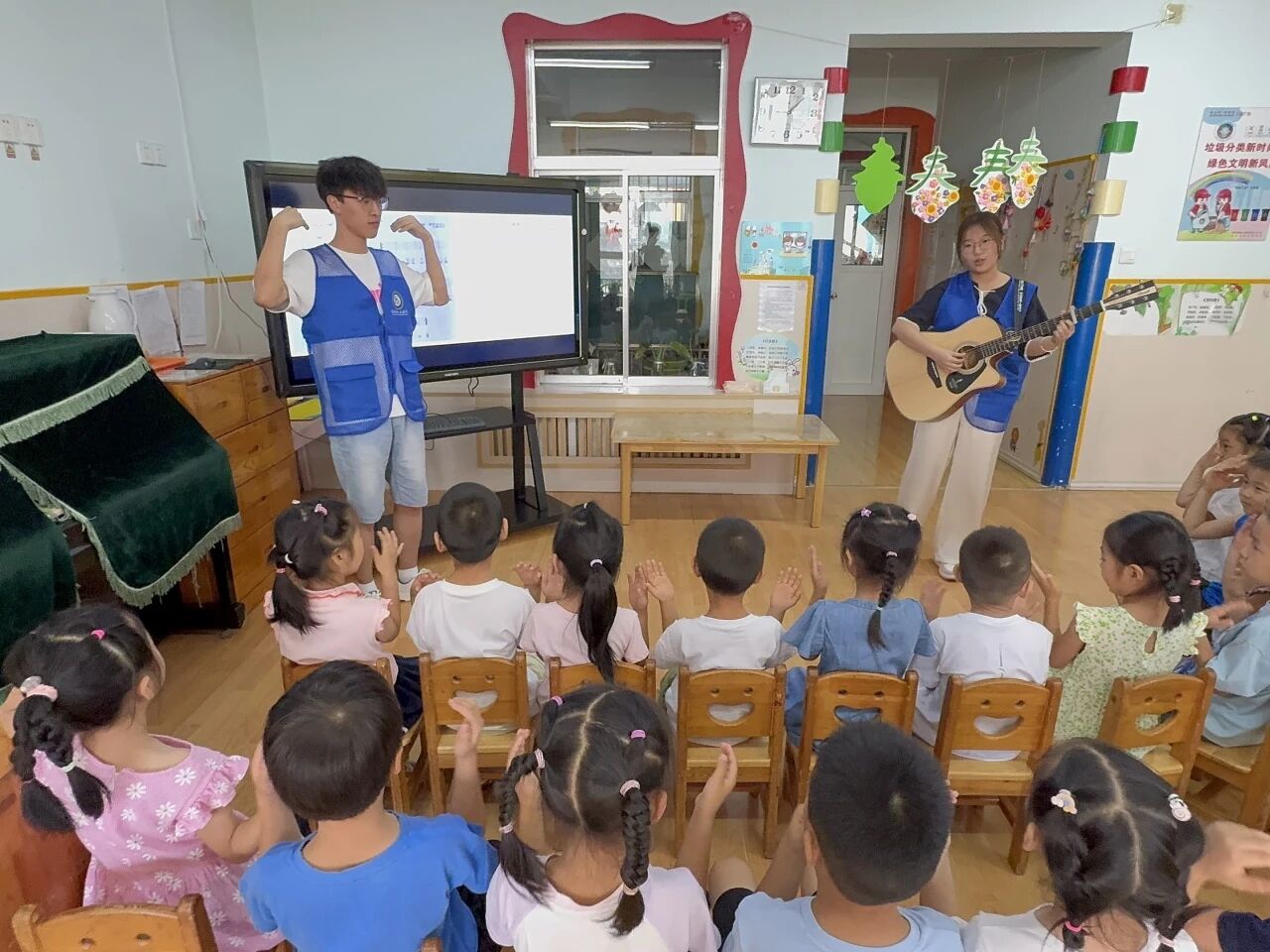 活动伊始,团队成员通过实物展示与音频互动的方式,让孩子们观察不同乐器的外形特点,聆听每种乐器独特的音色。团队成员耐心讲解乐器的名称与发声原理,引导孩子们感受“弦音”“铃声”的差异,探索音律的奥秘。教学环节中,团队成员以趣味游戏的形式,向孩子们教授简单的音律节拍知识,通过拍手、跺脚等互动方式帮助孩子们理解“强拍”“弱拍”的概念,让抽象的音乐知识变得直观易懂。孩子们积极参与,在欢声笑语中加深了对音乐节奏的感知。教学结束后,团队成员利用吉他现场演奏,带领孩子们学习《新年歌》和《小星星》两首经典儿歌的弹唱。孩子们跟着旋律轻声跟唱,小手跟着节奏拍打,在朗朗上口的歌声中感受音律与歌词的融合之美。活动最后,团队成员还带领孩子们练习了手势舞。孩子们跟着示范做出对应动作,歌声与手势相互配合,现场洋溢着童真与欢乐。