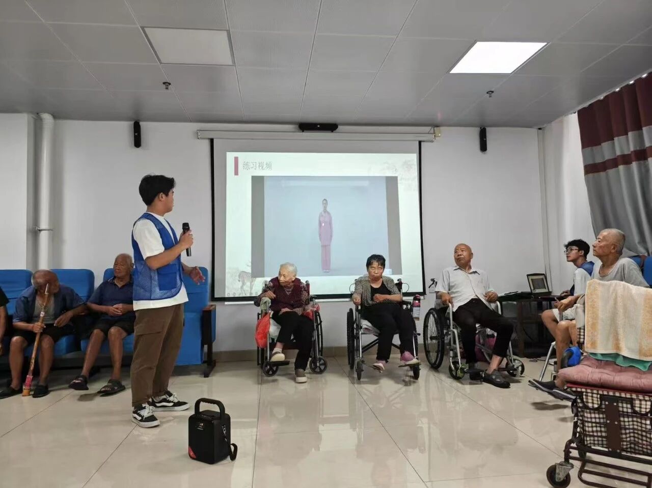 活动伊始,团队成员借助图文并茂的PPT,向养老院老人系统讲解八段锦的起源、发展脉络、动作要领及养生功效,帮助老人初步感知传统健身功法的独特魅力。随后,团队成员转至养老院活动场地开展实践教学,在完成标准动作示范后,采取一对一指导的模式协助老人进行练习,并结合老人的身体状况与接受程度灵活调整教学策略,助力其逐步掌握动作要领。同时,互动环节有效激发了老人的参与热情,促进了知识传递与情感共鸣。活动最后,团队成员与老人展开深入交流,细致了解其学习体验与实际需求,通过针对性反馈进一步巩固活动成效。