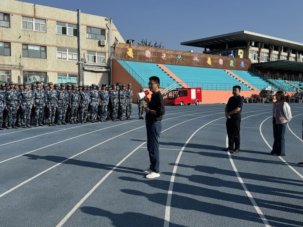 慰问现场,李玉保首先对新生们在军训期间展现出的坚韧意志、昂扬风貌给予高度评价,肯定了新生在汗水与坚持中展现的青春担当。随后,他围绕新生成长与未来发展,提出三点殷切期望:一是锚定专业方向,筑牢学业根基,探寻兴趣与专业的契合点;二是保持求知热忱,深耕学业土壤,拓宽知识边界;三是培育兴趣爱好,丰富精神世界,实现全面发展。他希望新生们将军训中锤炼的意志品质转化为学习的动力,以“不怕苦、不服输”的劲头面对未来的挑战。随后,公司领导与师生、教官进行交流,细致询问训练进度、后勤保障及身体状况。新生们纷纷表示,今后将把这份温暖转化为前进力量,以军训为起点,用实际行动续写青春奋斗篇章,在大学新征程中勇毅前行。