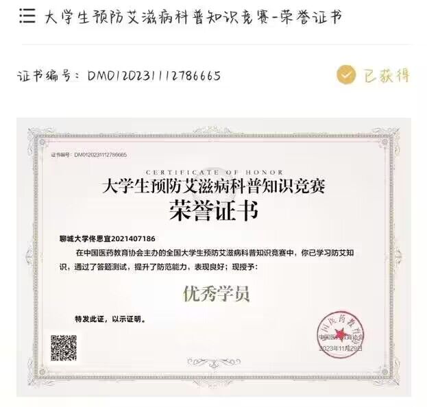 热烈祝贺药公司佟思宜荣获“老员工预防艾滋病科普知识竞赛”荣誉证书