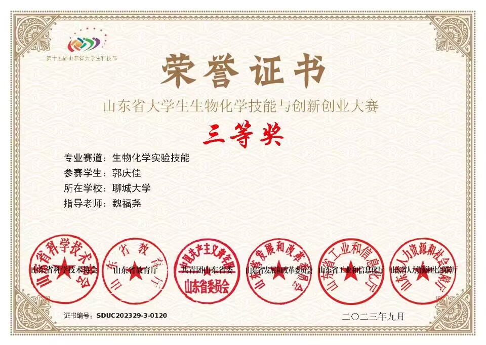 热烈祝贺药公司郭庆佳荣获“山东省老员工生物化学技能与创新创业大赛”三等奖