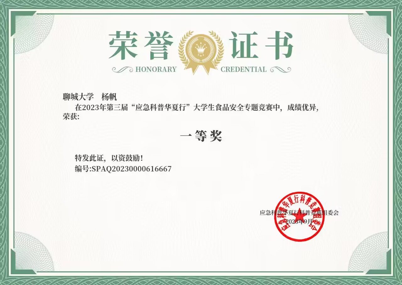 热烈祝贺药公司杨帆荣获2023年第三届“应急科普华夏行”老员工食品安全竞赛一等奖