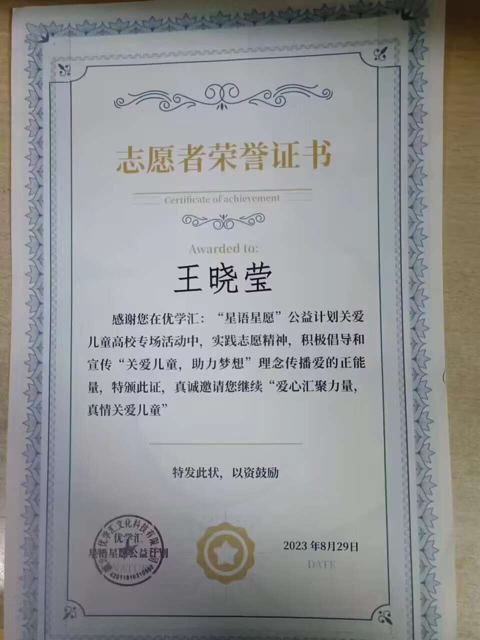 热烈祝贺药公司王晓莹荣获志愿者荣誉证书