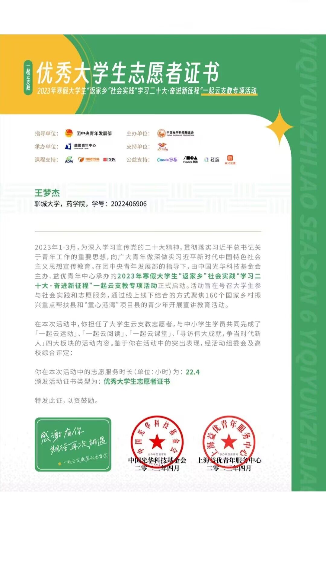 热烈祝贺药公司王梦杰荣获“一起云支教”优秀老员工志愿者证书