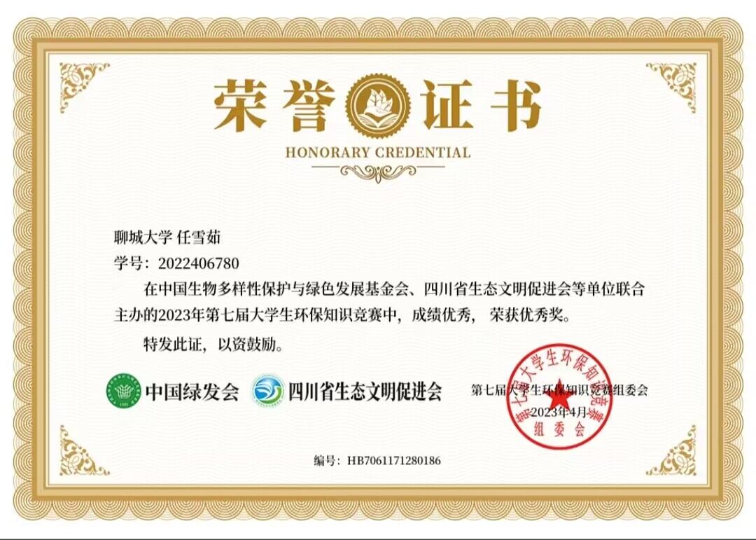 热烈祝贺药公司任雪茹荣获“第七届老员工环保知识竞赛”荣誉证书