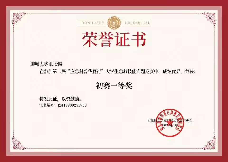 热烈祝贺药公司孔盼盼荣获“第二届应急科普华夏行老员工急救技能专题竞赛初赛”一等奖