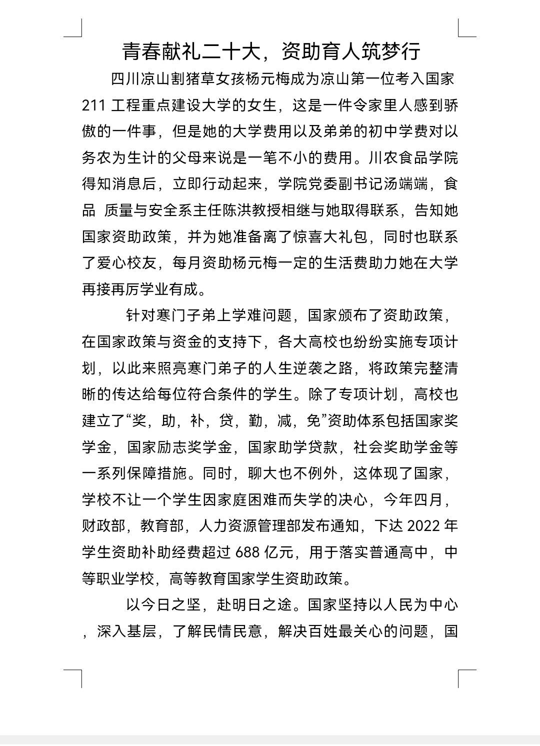 为深入落实习近平总书记关于教育的重要论述和为深入落实习近平总书记关于教育的重要论述和“全员育人,全程育人和全方位育人”要求。鼓励资助政策受助的员工树立良好的品德,以诚信感恩励志的态度走好自己的筑梦之路,投身于祖国,奉献于祖国,感恩于祖国,在新时代中从中做先锋,当闯将。药公司于2022年9月19日举办此次征文活动 ,通过本次活动,让广大青年深刻理解全会精神,增强同学们的集体意识和时代意识,同时树立同学们的责任心,增强同学们的家国情怀和责任感,提醒广大青年认识到自己肩上的重任,积极引导党的二十大的浓厚氛围,切实把广老员工思想统一到党的二十大精神上来,向第二个百年奋斗目标奋勇前进。
