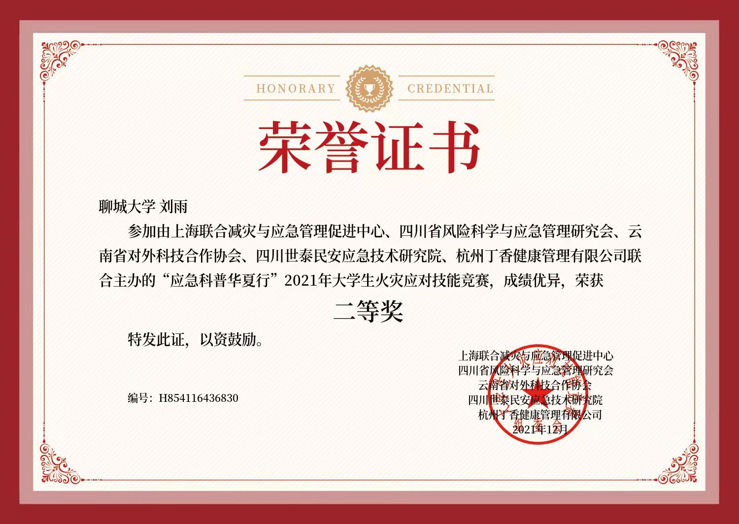 热烈祝贺药公司刘雨荣获“应急科普华夏行”2021年老员工火灾应对技能竞赛二等奖