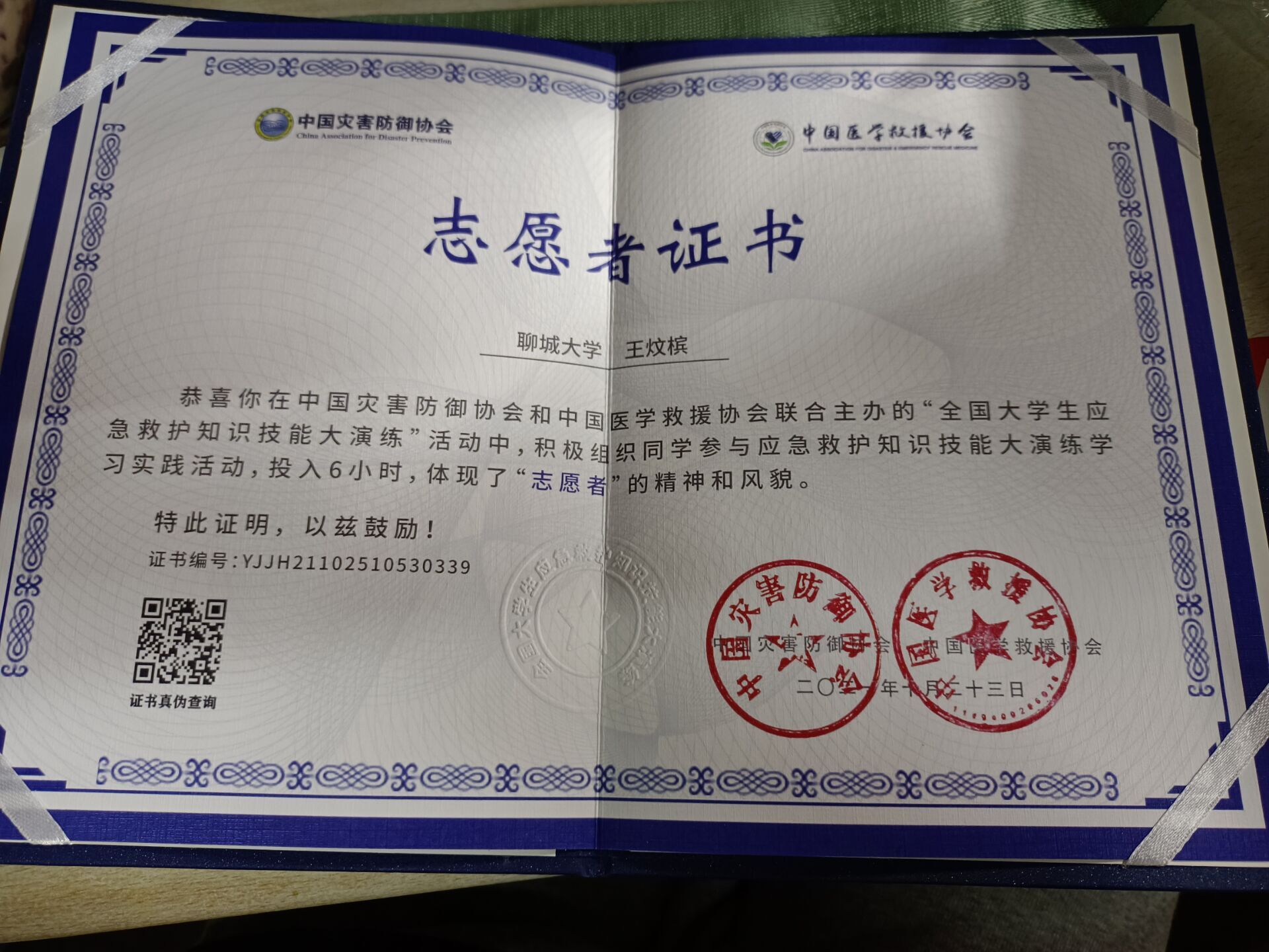 热烈祝贺药公司王炆槟荣获“全国老员工应急救护知识大演练”志愿者证书