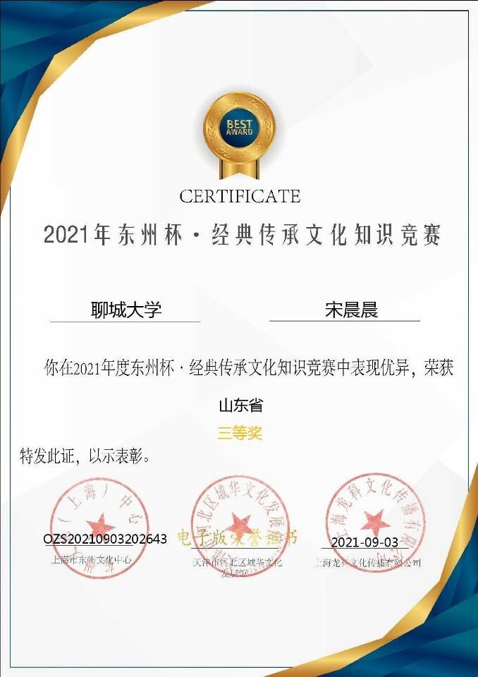 热烈祝贺药公司宋晨晨荣获2021年东州杯·经典传承文化知识竞赛三等奖