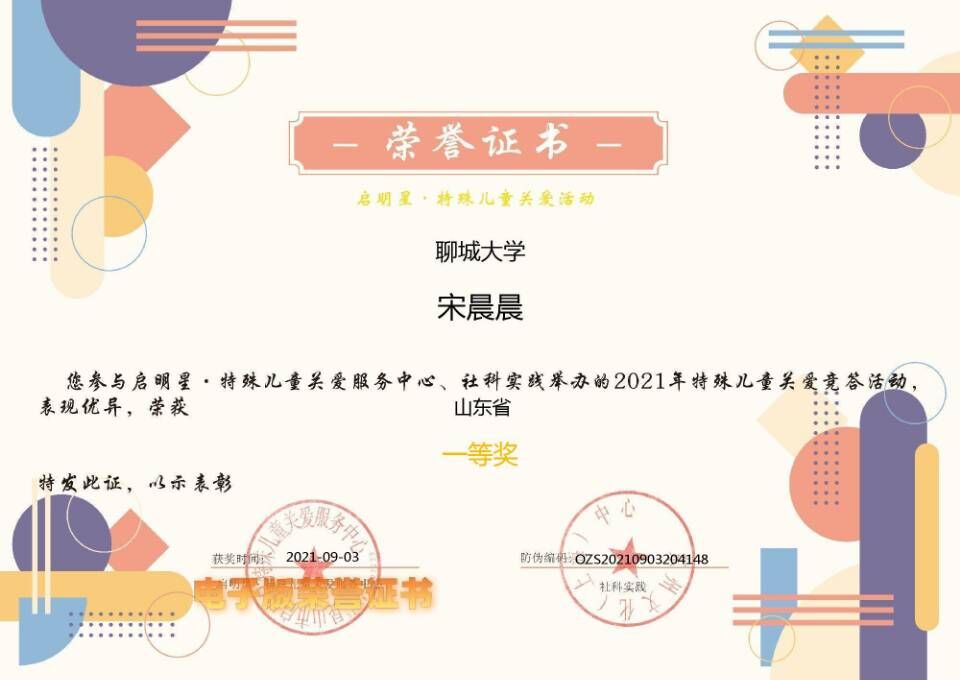 热烈祝贺药公司宋晨晨荣获2021年启明星特殊儿童线上关爱活动一等奖