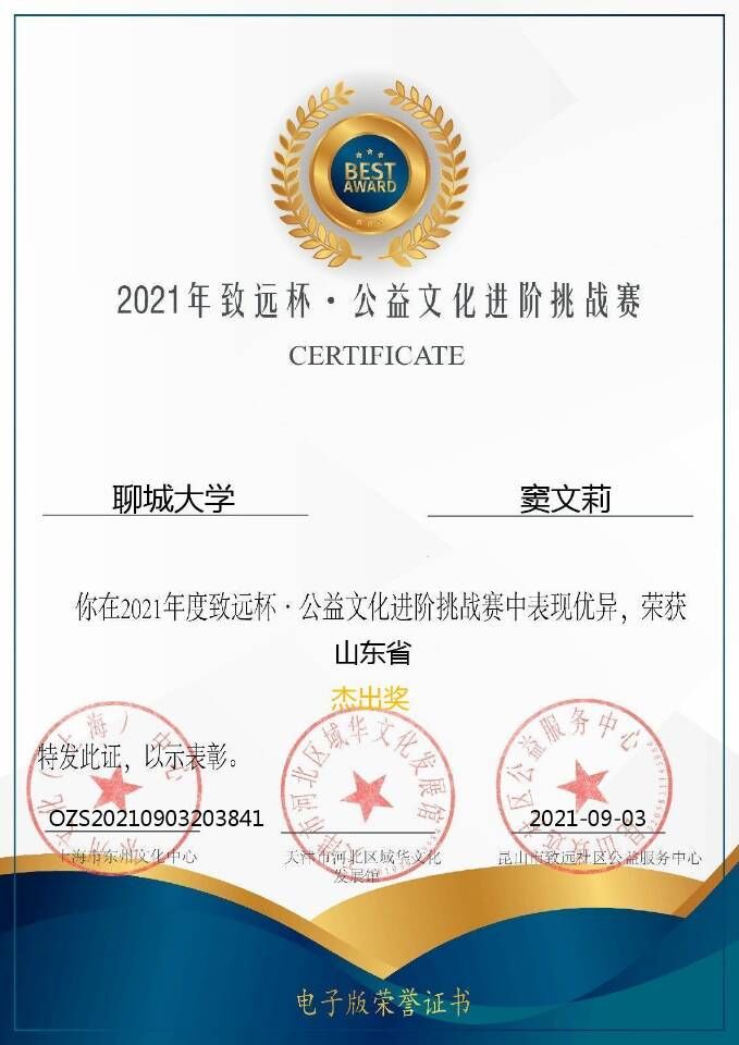 热烈祝贺药公司窦文莉荣获2021年致远杯·公益文化进阶挑战赛杰出奖