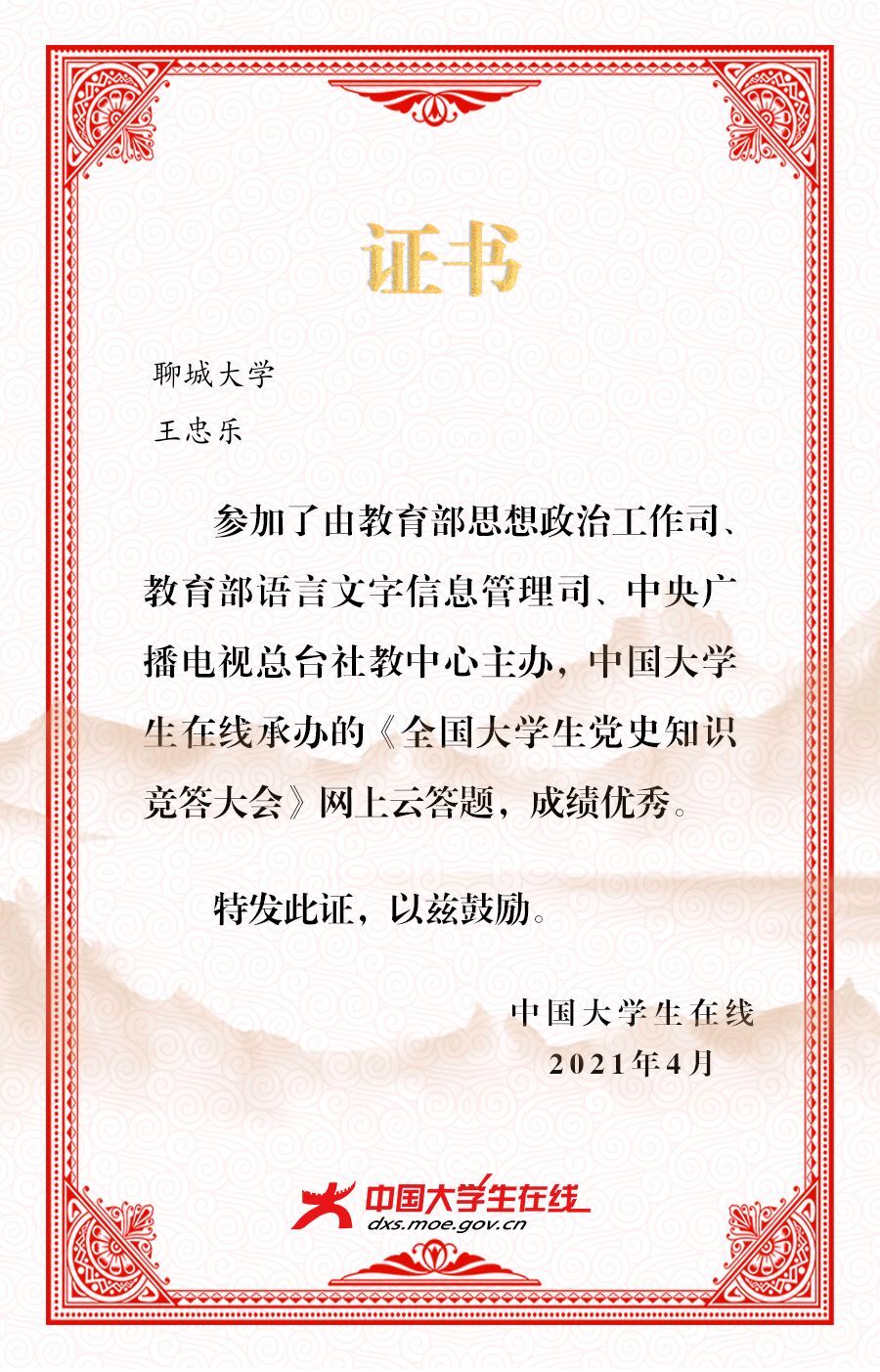 热烈祝贺药公司王忠乐荣获《全国老员工党史知识竞赛竞答大会》网上云答题活动证书