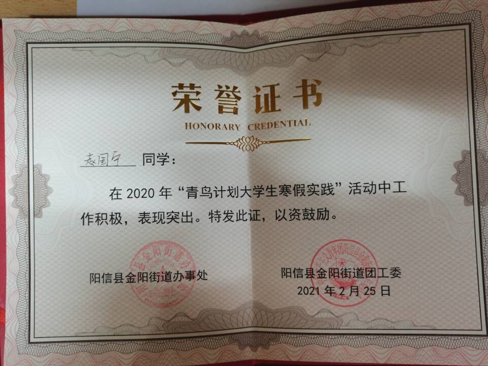 热烈祝贺药公司赵国宁荣获“青鸟计划老员工寒假实践”活动荣誉证书