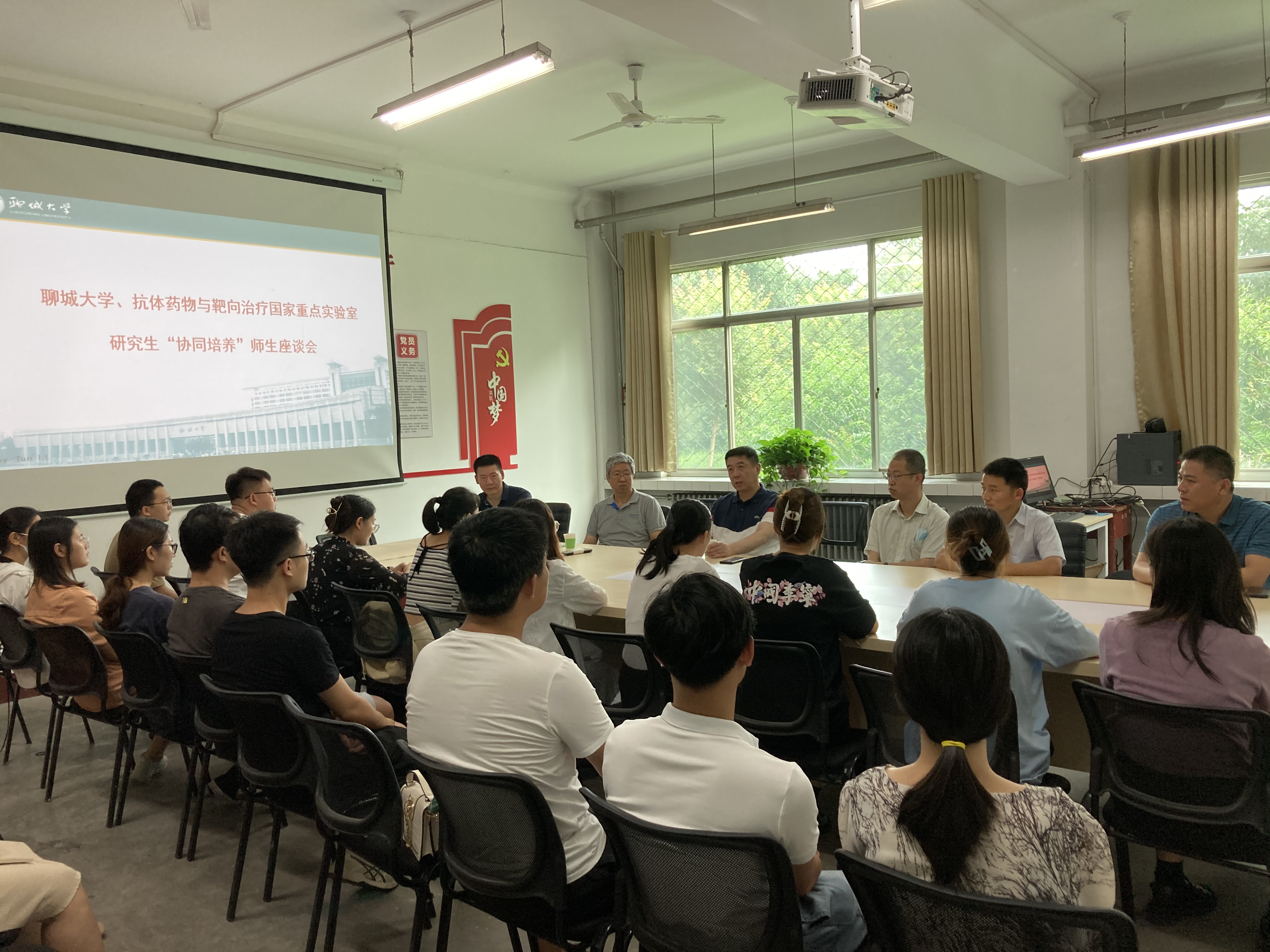 郭亚军教授团队与药公司部分教师和全体研究生进行了座谈。郭亚军教授向研究生介绍了抗体药物与靶向治疗国家重点实验室、抗体药物国家工程研究中心、泰州迈博太科药业有限公司的抗体药物研发平台,鼓励研究生立志于抗体药物研发事业,并表示将继续与药公司深化科研合作、深入推进研究生“协同培养”,提高人才培养质量。郭亚军教授团队成员李诚、张大鹏和郭怀祖博士参加座谈,并分别与研究生进行了深入交流。药公司执行经理柳仁民主持座谈,并代表公司向郭亚军教授团队对药公司创建和发展的长期支持表示衷心的感谢。药公司党委书记刘德芳参加座谈。
