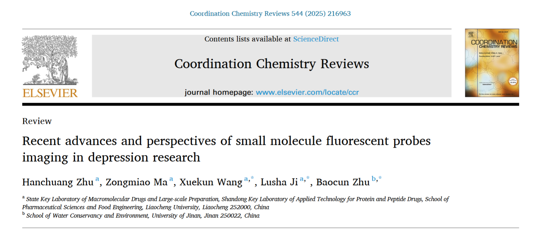 近日,公司重大疾病治疗药物靶点研发团队在化学领域国际顶级期刊《Coordination Chemistry Reviews》(中科院一区,影响因子23.5)发表题为《Recent advances and perspectives of small molecule fluorescent probes imaging in depression research》的综述论文。该研究系统总结了小分子荧光探针技术在抑郁症机制研究与临床诊疗中的前沿进展,为推动小分子荧光探针技术在抑郁症精准诊断中的临床转化应用提供了重要理论支持。