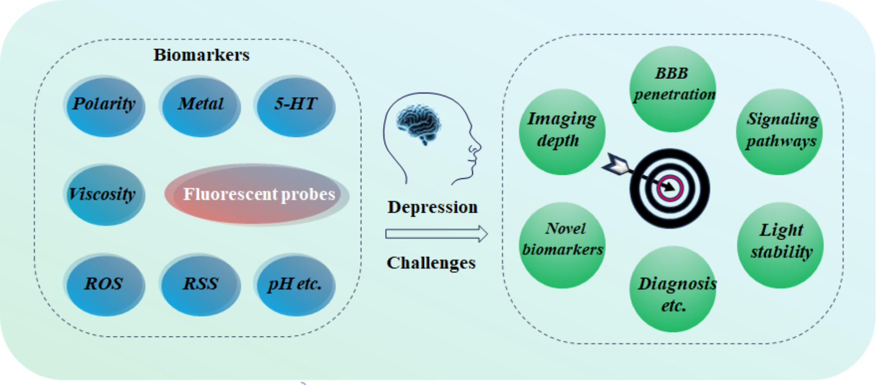 该综述全面梳理了与抑郁症相关的关键生物标志物(如神经递质、活性氧、金属离子等),详细阐述了针对不同靶点设计的小分子荧光探针的设计策略、识别机制及活体成像应用。