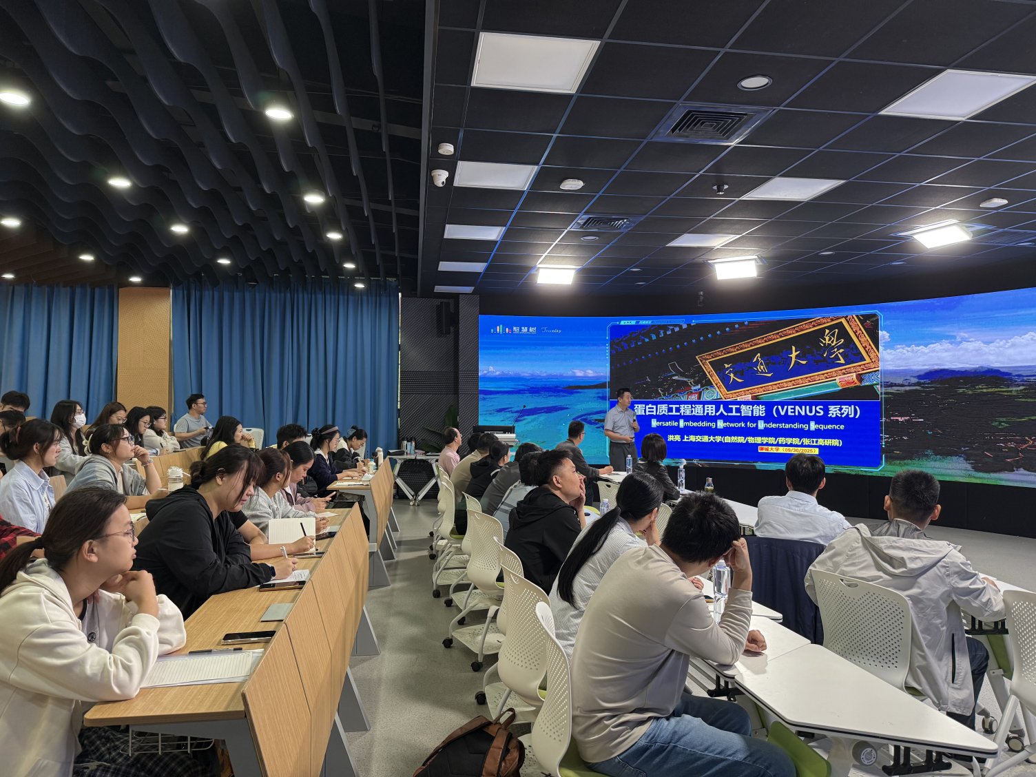 会上,洪亮教授为三亿体育官网师生带来了一场题为“蛋白质工程通用人工智能(VENUS系列)”的系统工作报告。报告中,洪教授首先深入阐释了其团队开发的“Venus-FSFP”小样本学习方法。该方法创新性地融合了元学习算法与物理计算,通过“单步交替训练”和“生成再蒸馏数据增强”等策略,有效解决了生物实验中高精度数据稀缺的核心痛点,实现了在极少量湿实验数据支持下对蛋白质语言模型的高效优化。随后,他以“全球首个经大模型设计实现产业化的蛋白质产品”-耐碱亲和层析填料蛋白为例,生动诠释了该技术的巨大应用价值。面对该关键原料在工业生产中耐碱性差、寿命短、成本高昂的难题,团队利用AI模型进行理性设计,成功将蛋白质的耐碱性提升了4倍,使层析填料的使用寿命延长了一倍。这一突破性改造,不仅将开发周期缩短至仅11个月,更直接助力合作企业金赛药业实现了每年超过千万元的成本降低,目前该产品已成功完成5000升规模的大批量生产,充分验证了AI驱动蛋白质设计从理论创新到产业落地的完整闭环。洪教授的报告清晰地表明,人工智能,特别是小样本学习技术,正以前所未有的力量重塑蛋白质工程的研发范式,为生物制造领域的降本增效与技术创新开辟了充满希望的路径。