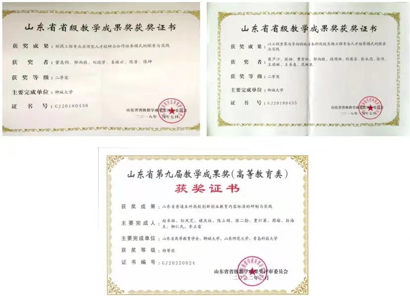 “十三五”期间,生物制药专业承担山东省高水平应用型重点建设专业项目,并于2019年获批山东省一流专业建设点;制药工程专业承担“山东教育服务新旧动能转换专业对接产业”项目。建设了《生物化学》、《药理学》、《药剂学》、《药物分析》和《药物化学》5门在线开放课程。2023年《生物化学》课程获批国家一流课程,2024年《分子生物学》课程获批山东省一流课程。公司共获批省级以上教学改革项目7项。出版教材2部(科学出版社),发表教研论文20篇,其中EI论文2篇,核心期刊6篇。本专业教师参加省部级教学竞赛9项,其中获国家级二等奖1项,三等奖2项,优秀奖1项。获山东省本科教学成果二等奖2项,特等奖1项。