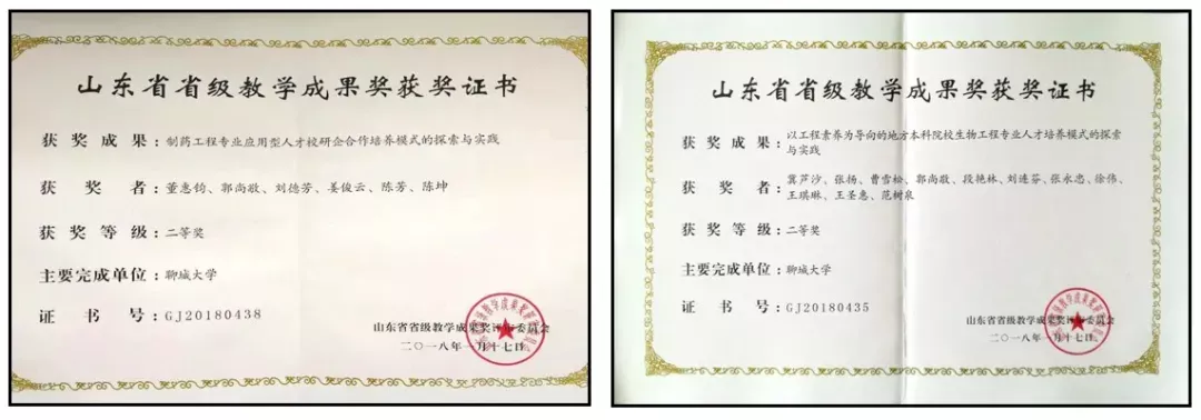 专业教师参加省部级教学竞赛8项,其中获国家级二等奖1项,三等奖2项,优秀奖1项。2018年,公司教研项目“以工程素养为导向的地方本科院校生物工程专业人才培养模式的探索与实践”、“制药工程专业应用型人才校研企合作培养模式的探索与实践”均获山东省本科教学成果二等奖。