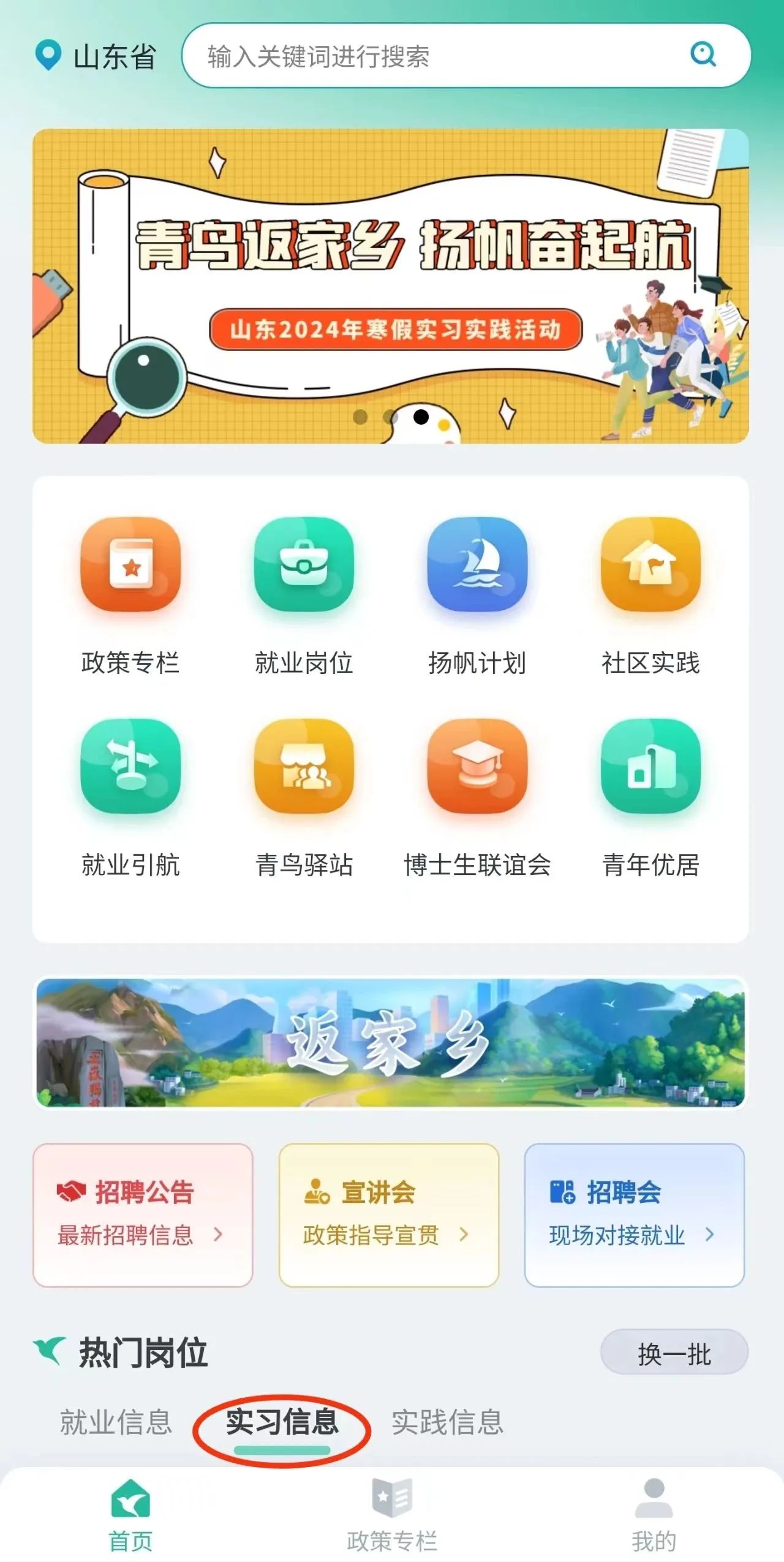 6、在“首页”下方“实习信息”查看意向服务地实习岗位信息,选择心仪的岗位,分别经所在公司团委和用人单位审核通过后,待用人单位通知后开始实习实践。